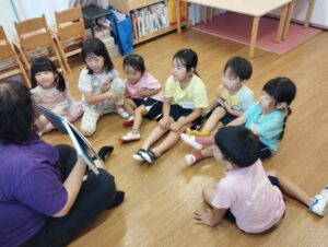カードゲームをしたり、絵本ではいろいろな動物などが登場し、発音を一つひとつ練習しながら、時どき鳴き声も真似たりして、最後まで楽しみながら参加できていました。
