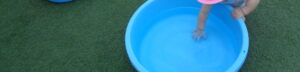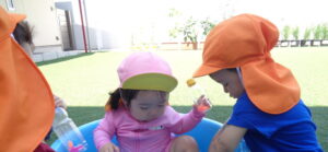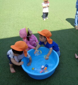 水遊びのおもちゃを出してあそんでいると、ひまわり組さんも水遊びに参戦!