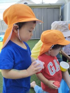 タライの水を保育者が手でバシャバシャしたら、面白かったみたいで「せーの」で今度はみんなでバシャバシャしました。