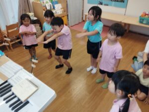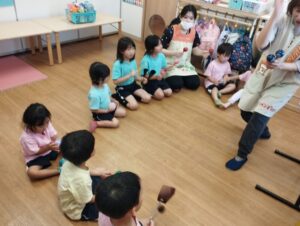 今日は、リトミックがありました。海の生き物のエビやサメ、こんぶなどになりきり、音楽に合わせて楽しんでいました。珍しい楽器にも触れ、どんな音なのかを聴きながら演奏もしました。次のリトミックの時間が楽しみのようです😄
