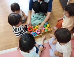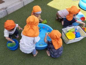 コップを使って金魚すくいのように、水に浮かんでいる玩具をすくいあげたり、バケツの中が水でいっぱいになるまで、コップで水を運んだりして、みんなとってもにこにこ笑顔で集中して遊んでいました。