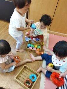 お野菜や果物の玩具も出して遊んでいると……