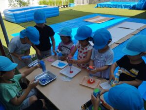そら組さんは、絵の具を容器に出し、準備を整えることから始めました。