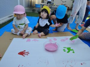 絵の具を手足や紙につけて感触や色彩を楽しんでいました。