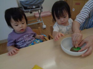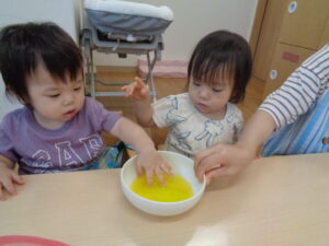 黄色の少しとろみのついたお水に興味津々のお友だち。