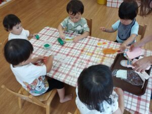 「今日は寒天で遊ぼう」と保育者が言うと、なに?なに?という顔で椅子に座り、わくわく期待の眼差しで待っていました♪