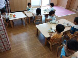 今日はめろん組のお兄さんお姉さんと一緒に、給食を食べました。
