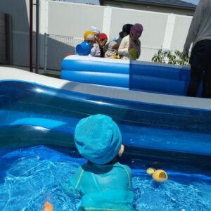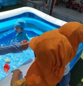 準備をして庭園に出ると、他のクラスのお友だちがいて、楽しいプール遊びや水遊びが始まっていました。