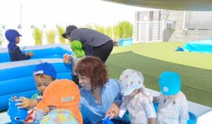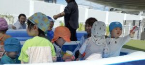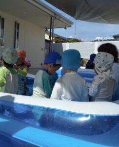 今日は、体験入園のお友だちが2人遊びに来てくれました。最初はひまわり組さんも、照れくさそうにしていましたが、一緒にプール遊びやおままごとを楽しんだあとは、「バイバイ」と笑顔で手を振り合っていました。
