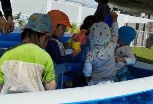 だんだんはげしく水をバシャバシャしたり、カップですくったりして、プール遊びを楽しみました。