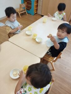 朝のおやつのうの花クッキーを食べている時、「まんまるお月さま🌝」パクパクっと食べてまた「お月さま🌙」と楽しそうに食べていました😊