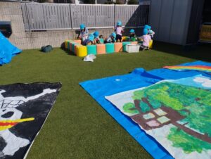 今日は、ポカポカお日様の下で、劇に使う背景画をみんなで描きました。