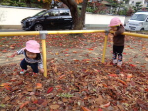保育者が落ち葉を拾って、上から紙吹雪のようにパラパラ~🍂