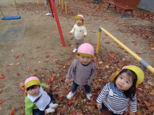 手に持って落としてみたり、落ち葉の上を歩いてカサカサという音がするのを楽しんでいます(#^^#)