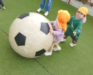 園庭では、大好きな手押し車に乗ったり、大きなボールをお友だちと転がし追いかけたりとニコニコ笑顔が絶えませんでした。
