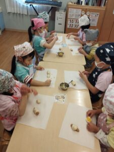 中にコーンをいっぱい入れて餃子に見立てたり、上にコーンをトッピングをしたりと個性溢れるパンが出来上がりました😄