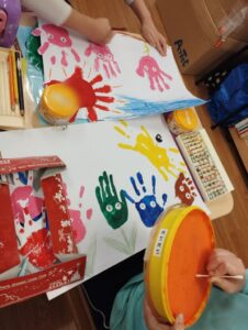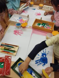 今日は、前もって準備した自分の手形足形を使い何かに見立て作品を作りました。