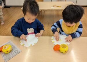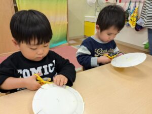 のり貼りでは上手に人差し指をピーン!と出してのりをすくって、片手で紙皿を上手に抑えて貼ることができました。