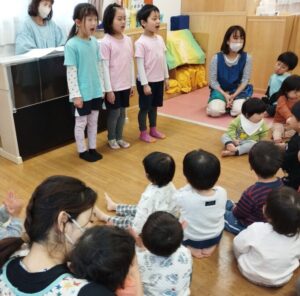 まずは、お兄さん、お姉さんが前に出て歌うのを座って聞きました。素敵な歌声だったので、ひまわり組さんは聞き入っていましたよ✨