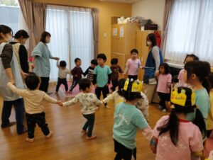 という保育者の声かけで、お兄さん、お姉さんが手を繋いでくれて素敵な一つの輪ができました。7ステップの曲に合わせて右や左にクルクル回ったり、真ん中に集まって小さな輪になったりしました。ニコニコ笑顔で楽しそうでした。