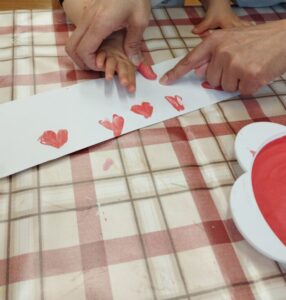 少し難しいので保育者と一緒に頑張ってペタッペタッ。「かわいくできたね」と保育者が言うと真剣だった表情が和らいで笑顔になりました😊