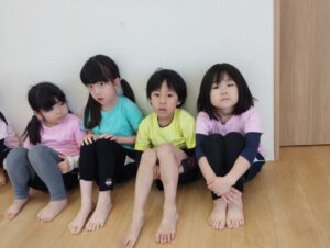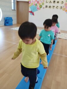 そら組さんは、体操教室で大型ブロックの橋を渡ったり、輪っかの中を跳んだりしました。3歳児さんは初めての体操教室で緊張していましたが、最後は楽しめていました。
