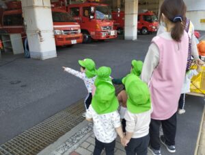 めろん組さんとひまわり組さんは一緒に消防署まで散歩に出かけましたよ。