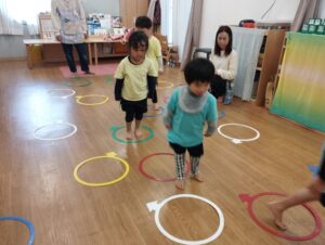 輪っかから輪っかへ両足飛びやケンケンでジャンプ!!