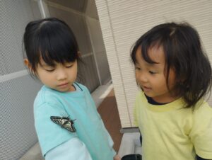 そら組さんが給食を食べている時にテラスにアゲハ蝶が遊びにきました。