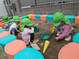 めろん組さんは、砂場遊びをしました。カップを上手にひっくり返して美味しそうなプリンが仕上がりました。