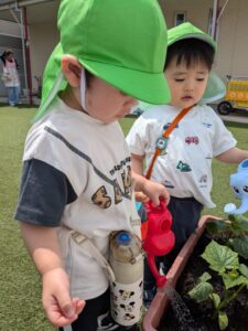 ひまわり組さんとめろん組さんはおやつを食べてから毎日の日課のお水やり🌼