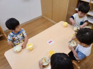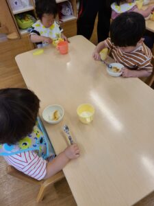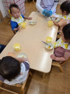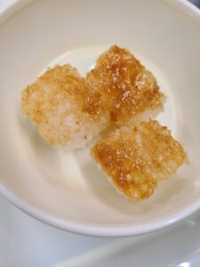 保育園では、つぶしたご飯(うるち米ともち米をミックスしています)を鉄板に広げて味噌を塗ってオーブンで焼きますが、