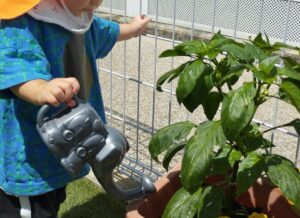 園庭に出て、お野菜に水やりをした後、水遊びをしました。