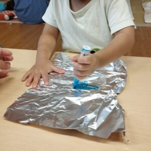 製作の時間では、ペンで描いたところに、霧吹きで水をかけ模様作りをしました。