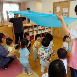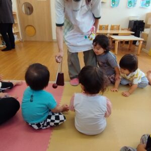 シフォン布の下では、ふわりふわりと落ちてくるのを楽しんでいました。子どもたちは、こういう遊びが大好きです💕ヴィブラスラップという珍しい楽器に触れ、興味津々の様子でした(*^-^*)