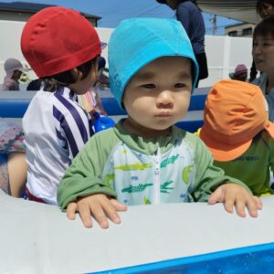 保育園のみんながプール遊びをしている時には、太陽は少し休憩していたようで、程よい暑さでプールに入れましたよ😊