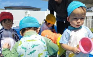 今日のひまわり組さんは、プール遊びをしました。暑い日が続いているので、子どもたちは水遊びを喜んでいます。ジョーロでお友だちにそっと水をかけたり、お気に入りの玩具で遊んだりしました。