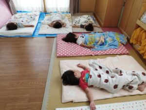 給食もお腹いっぱい食べたので、ひまわり組の子どもたちは、ぐっすりと眠り夢の中です(-_-)zzz