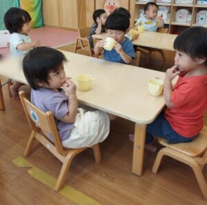 プールの後は、水分補給の時間です。たくさん遊んだので、お茶をおいしそうにゴクゴクと飲み干していました。