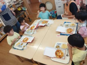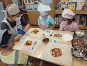具材ごとに並べてのせたり、コーンをメインにのせたりなど一人ひとりおいしそうなピザができあがりました☆