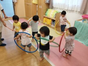 リトミックの後は、フラフープを一人一つずつ持ってお部屋の中をお散歩したり、指先を使う玩具で集中しながら遊びました😊