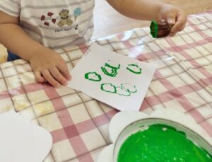 みんなで育てたピーマンでスタンプあそびをしたのがとても楽しかったので、うちわも作りました。素敵なうちわが完成!