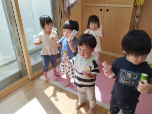 その後、水あそびをしましたが、そら組さんと一緒に、氷を触って冷たさを味わっていました。