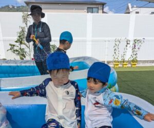 水鉄砲で友だちや先生と水をかけ合ったり、夢中で楽しむ子ども達でした。