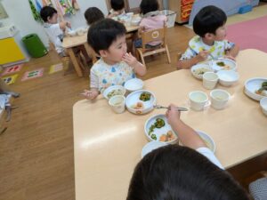 楽しんだ後は、みんなが大好きな給食の時間です。