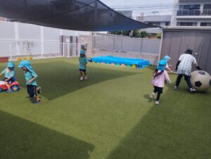 園庭では友だちと追いかけっこをしたり三輪車に乗ったりして遊びました。