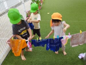 その後は園庭で泡遊びをしながら、バンダナやお人形の洋服などを洗いました。