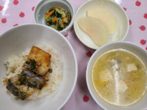 今日の給食は、さばのかば焼き丼、ほうれんそうの胡麻和え、すまし汁、梨でした🍚