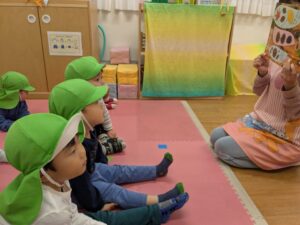 今日のめろん組さんは、散策前に絵本でいろんな葉っぱや木の実を見てお勉強。