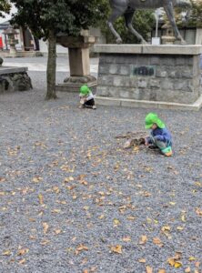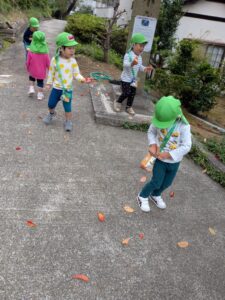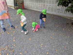 自分たちで作ったお散歩バックを初めて持ち、八幡神社に秋を探しに出発!